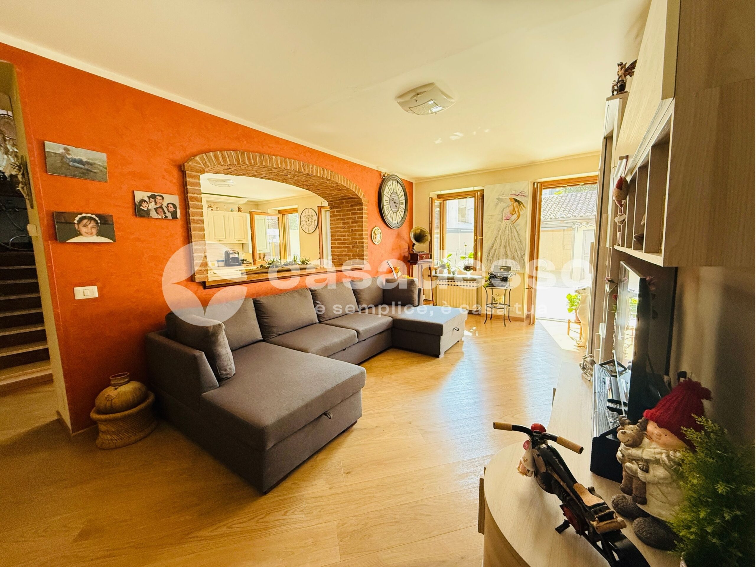 L’ingresso avviene tramite cancello che apre su un ampio cortile privato, oppure direttamente dalla strada attraverso una porta blindata. Al piano terra troviamo un grande soggiorno molto luminoso, con accesso diretto al cortile, e una cucina abitabile di generose dimensioni, anch’essa con uscita sullo spazio esterno, perfetta per la vita quotidiana e i momenti conviviali.
